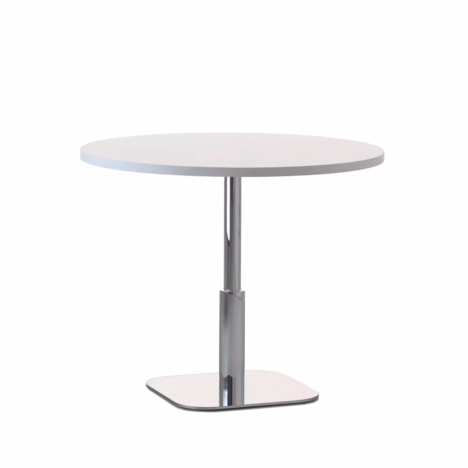 Demountable square plate table system fabricated in steel and cast aluminium. Wide selection of powder coat colours and tops. CATERPILLAR Pedestal Tables are offered in coffee, meeting, dining and bar table heights. Outdoor treatment available by project request.